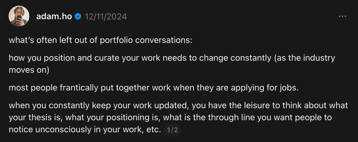 I want to share this post from Adam Ho that I agree with. But what I would also add is that you as a person and a designer evolve. And for e.g. I personally often find myself not relating to some statements that I made before.